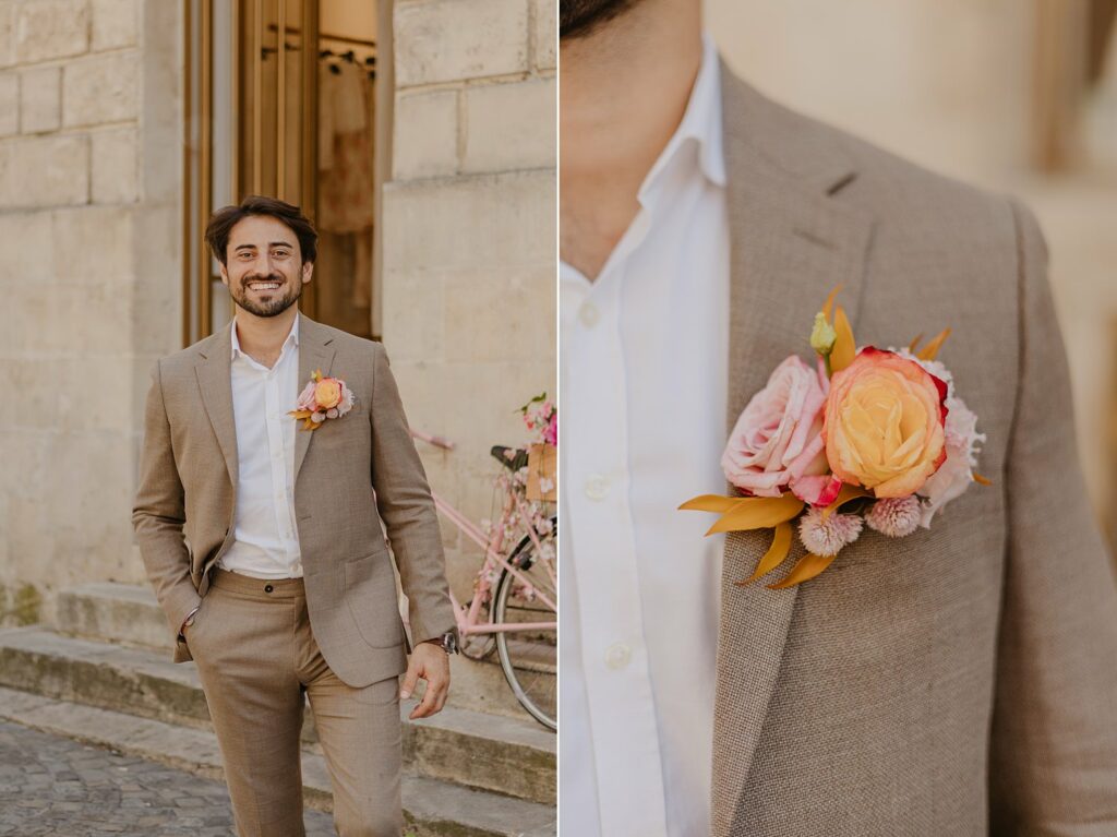 C’est un véritable coup de cœur parmi les accessoires pour un mariage original à Bordeaux : la boutonnière fleurie à glisser dans la poche de veste du marié. Fini les trous dans les vestes, les tissus abîmés ou les gestes maladroits de dernière minute. Cette alternative respecte le costume et permet au marié de profiter pleinement de sa tenue. Elle s’intègre parfaitement à l’élégance souvent recherchée pour votre mariage original à Bordeaux. C’est aussi une excellente manière de faire écho au bouquet de la mariée et aux compositions florales, renforçant ainsi la cohérence entre les accessoires originaux de votre mariage à Bordeaux.