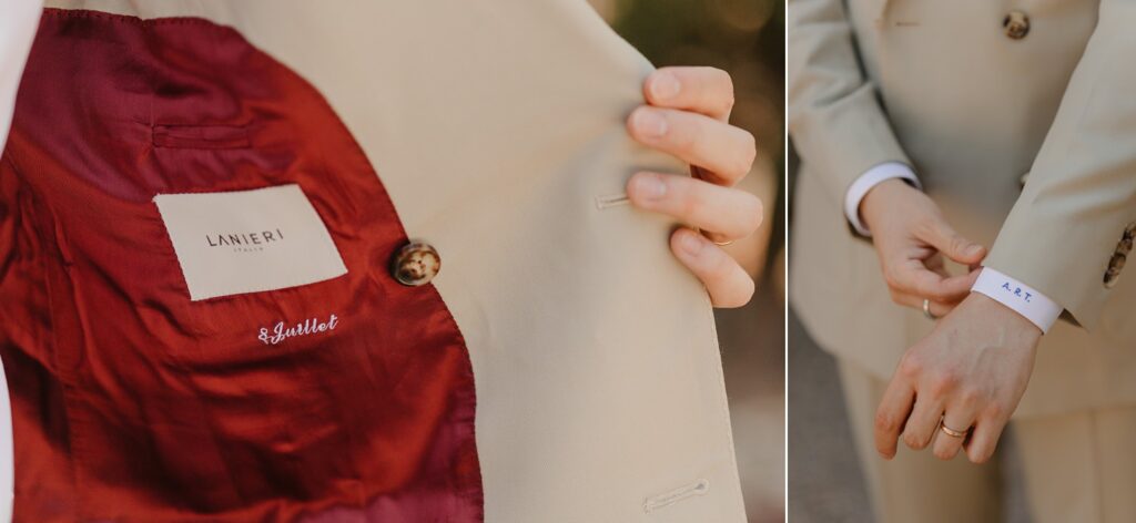 Ce type de détail de mariage raconte une histoire, celle du couple, de son engagement. Certains ateliers de costumes de mariage à Bordeaux proposent aujourd’hui des personnalisations discrètes et élégantes sur les vestes ou les chemises. Initiales, premières lettres des prénoms, date du mariage… Ces broderies deviennent de véritables signatures intimes, invisibles au premier regard mais chargées de sens pour ceux qui les portent contre leur cœur.
